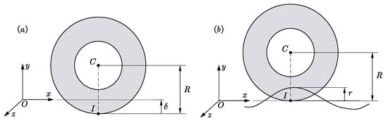 The dashed line in the figure represents the reference road surface position. The radius of the wheel is denoted by R. The contact depth is defined as . For a level road surface, as illustrated in Figure 8a, no contact force occurs if . Conversely, when , a contact force is generated. For an uneven road surface, as depicted in Figure 8b, the displacement of the road surface at the contact point relative to the reference position is denoted as r, where the positive r direction aligns with the y axis. A contact force does not occur if . If , a contact force is generated, with the contact depth defined as .
