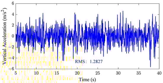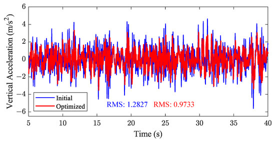 The vertical acceleration of the vehicle body center of mass, initially ranging from −5.62 to 4.63 , was reduced to -3.53 to 3.32 after optimization, reflecting enhanced ride comfort through the mitigation of extreme vertical oscillations. Additionally, the optimized vertical acceleration was reduced by 24.12%, significantly improving ride smoothness (Figure 16).