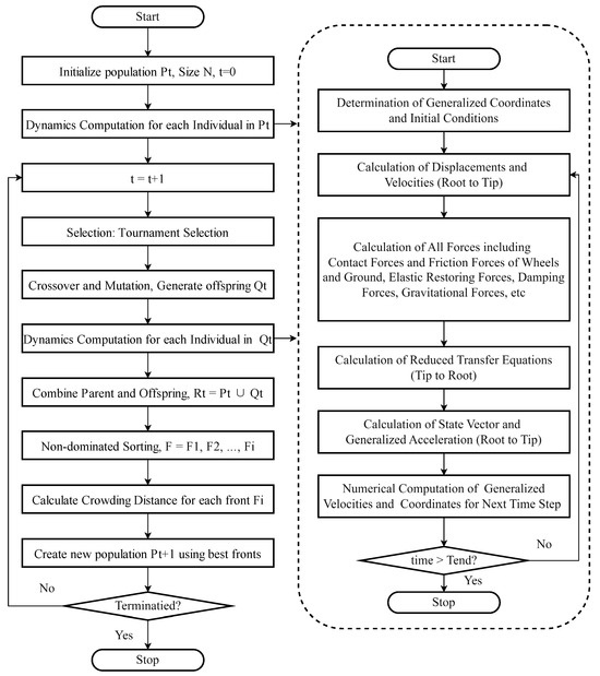 Vehicle system parameters often need to be optimized to cope with various complex working conditions. A multi-objective evolutionary method is a commonly used optimization algorithm. Deb et al. [31] developed one of the most significant variants of genetic algorithms, known as the Nondominated Sorting Genetic Algorithm II (NSGA-II). This multi-objective metaheuristic optimization algorithm utilizes the concepts of dominance and elitism to achieve a nondominated or Pareto-optimal front. Gadhvi et al. [32] conducted a comparative study on the multi-objective optimization of a half-car model’s passive suspension using three major evolutionary algorithms: NSGA-II, Strength Pareto Evolutionary Algorithm 2 (SPEA2), and Pareto Envelope-based Selection Algorithm II (PESA-II). Their results demonstrated that all three algorithms exhibited roughly similar performance. However, they observed that NSGA-II performed better in minimizing the objective vector, while SPEA2 and PESA-II tended to produce more diverse Pareto-optimal fronts. NSGA-II was also the algorithm chosen by Nagarkar et al. [33] for obtaining Pareto-optimal fronts related to the multi-objective optimization of passive suspension systems in a quarter-car model and a half-car model, respectively. Fossati et al. [34] proposed a multi-objective optimization method for the passive suspension system of a full vehicle model traveling on a random road profile. This method combines the NSGA-II algorithm and the time-domain vertical dynamic analysis of an eight-degree-of-freedom vehicle model with a seat to generate a Pareto-optimal front.