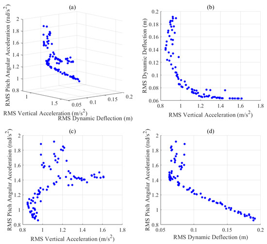 The Pareto front of optimization solutions offers a range of trade-off options for suspension design. For prioritizing ride comfort, solutions with lower are ideal, while enhancing dynamic stability requires selecting solutions with reduced . To achieve a balance between suspension travel utilization and vehicle stability, a compromise can be made between and . These choices enable tailored performance optimization based on specific design priorities.