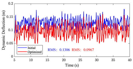 Comparison of dynamic deflection response of the front suspension system between the initial configuration and the optimized configuration. The RMS value decreases from 0.1306 m (Initial) to 0.0967 m (Optimized), demonstrating enhanced suspension performance with reduced suspension travel.
