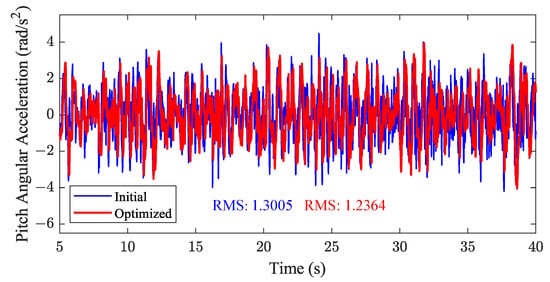 Comparison of angular acceleration response of the vehicle body center of mass between the initial configuration and the optimized configuration. The RMS value reduces from 1.3005 rad/s² (Initial) to 1.2364 rad/s² (Optimized), indicating improved vehicle stability by mitigating pitch motion.