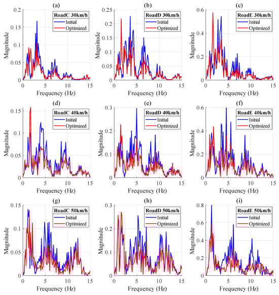 The optimized results indicate that through the adjustment of suspension parameters, the overall vehicle dynamics performance can be significantly improved. The robustness of the optimization results is verified, and the dynamic simulation of Class C, D, and E road conditions is completed at 30 km/h, 40 km/h, and 50 km/h. The frequency response of the vertical acceleration of the vehicle’s centroid before and after optimization is shown in Figure 19. The optimization significantly reduces the vibration amplitude, especially in the low-frequency range (0–5 Hz) and mid-frequency range (5–10 Hz). In the high-frequency range (10–15 Hz), the difference between the initial and optimization results is small, but there is still some improvement.