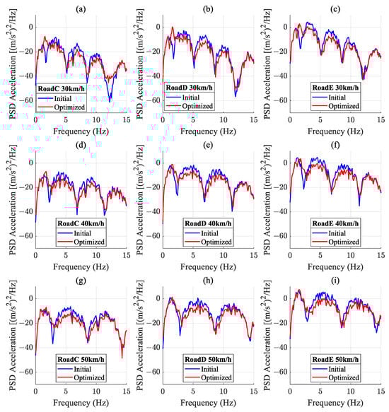 The PSD analysis of the vertical acceleration of the vehicle centroid is carried out, and the PSD curves before and after optimization are compared, as is shown in Figure 20. The results show that in all cases, the optimized PSD curves are lower than the initial curves, especially in the range of 4–8 Hz, which is considered to be the most critical frequency range for passenger comfort.