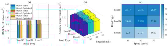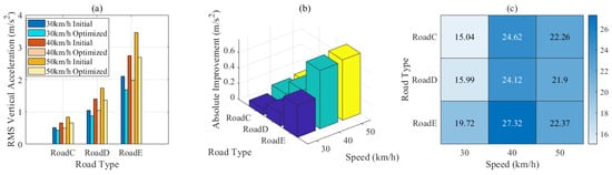 RMS vertical acceleration across different road types (C, D, E) and speeds (30, 40, and 50 km/h). (a) Comparison of initial and optimized values. (b) Absolute improvements. (c) Percentage improvements.