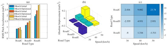 RMS pitch angular acceleration of the vehicle body center of mass across different road types (C, D, E) and speeds (30, 40, and 50 km/h). (a) Comparison of initial and optimized values. (b) Absolute improvements in pitch angular acceleration. (c) Percentage improvements.