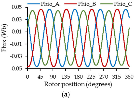 To follow the procedure for identifying of a PMSM with an FEA model shown in Figure 3, with the magnetization of the magnets suppressed, a simulation in steps of 0.5 degrees will allow identifying , for the and eccentricity coordinates. By supplying the winding with a direct current of 1 A, it can be deduced that the measured inductances will be equal to the flux captured for the coils. A similar procedure is carried out in Figure 4 to determine the no-load flux captured by the stator coils when the current flowing through them is zero.