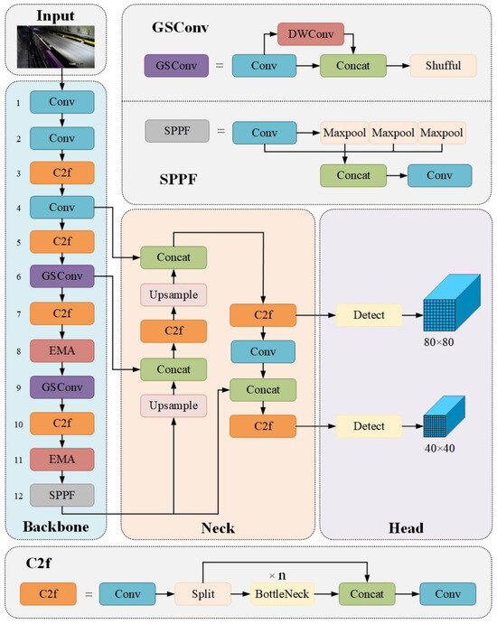 YOLOv8s, as a representative of the YOLO series, inherits and optimizes prior design principles, effectively extracting image features, achieving object detection, and maintaining high precision and speed [18]. However, the challenging environmental conditions in coal mine production demand higher speed, precision, and hardware efficiency for conveyor belt deviation detection [19]. To meet the detection requirements, this paper improves the original YOLOv8s network model and proposes a light-weight and efficient conveyor belt deviation detection method, named GES-YOLO. The overall structure of the GES-YOLO model is shown in Figure 1. In the backbone section, the two convolution (Conv) modules at the end are replaced with GSConv modules, and the EMA attention mechanism is added after the two Channel-to-Feature (C2f) modules at the end, aiming to improve the detection accuracy and reduce the computational complexity of the model. In the head section, the redundant 20 × 20 large object detection layer is removed, further reducing the number of model parameters. In the backbone section of Figure 1, Conv represents the standard convolution, GSConv denotes the light-weight convolution, and the C2f module is used for feature aggregation. Spatial Pyramid Pooling—Fast (SPPF) refers to the Spatial Pyramid Pooling module, which is responsible for fusing features at different scales. In the neck section, Upsample is the upsampling module, and Concat is the feature concatenation module. The head section includes detection heads for 80 × 80 and 40 × 40 objects.