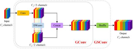 where W stands for the output feature map width, H denotes the output feature map height, denotes the convolutional kernel size, denotes the channel number in each convolutional kernel, and denotes the channel number in the output feature mapping. DSConv shows the lowest time complexity when is greater than 1. GSConv is between Conv and DSConv, reducing the computational cost by approximately 50%. While Conv preserves hidden connections between channels, DSConv eliminates them entirely, significantly lowering the complexity. In contrast, GSConv retains these connections with a lower time complexity, thus reducing the computational cost while maintaining strong feature extraction capabilities [24].