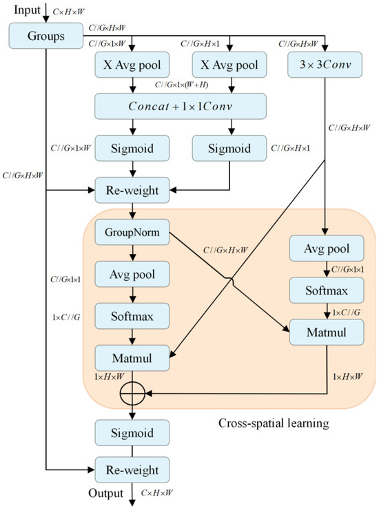 As depicted in Figure 3, for a given input feature map , the EMA partitions X into G sub-feature groups along a cross-channel dimension to capture disparate semantic information. Each group’s style is denoted as , . Learned attention weights enhance the representation of important regions in each sub-group. For every sub-feature group, we adopted three parallel paths for extracting attention weights: two convolutional branches and one convolutional branch. A convolutional branch uses adaptive global average pooling operations along both the horizontal and vertical directions. The outputs of the two branches are subsequently cascaded and aggregated using a shared convolution, followed by nonlinear fitting through activation layers. The third branch captures multi-scale feature representations via a single convolution. In the cross-space learning component, the and convolutional branches’ outputs are encoded by globally averaging the pooled outputs. The attention weights from different branches are then fused using matrix multiplication. This process effectively aggregates spatial information across different scales to generate the final feature representation.