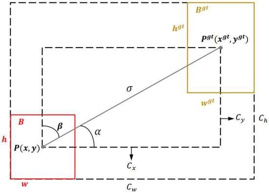 where represents the value of the loss function, represents the Intersection over Union (IoU) of the overlapping area between the predicted and ground truth bounding boxes, refers to the predicted bounding box, indicates the center of the ground truth bounding box, denotes the Euclidean Distance, denotes the diagonal distance of the minimum enclosing bounding box for the predicted and ground truth boxes, and and are penalty factors. and are calculated using the following equations: