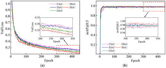 As shown in Figure 5a, the SIoU loss function exhibits less fluctuation, decreases in loss more rapidly, and achieves a smaller convergence loss in comparison with the CIOU, DIoU, EIoU, and GIoU. Figure 5b shows that the SIoU loss function has a higher mAP value. In summary, the SIoU loss function demonstrates the best convergence, with faster speed and higher localization precision. Therefore, the SIoU loss function is selected as the loss function for the improved model.