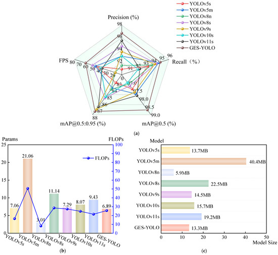 To further validate the practical effectiveness of the GES-YOLO, widely used and industry-representative network models, including the YOLOv5 series, YOLOv8 series, YOLOv9, and YOLOv10, were selected for comparative testing. All models were trained and tested on the same dataset, using identical evaluation metrics as criteria. The experimental outcomes are presented in Table 5.