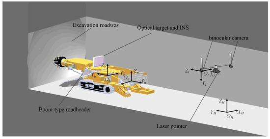 - The carrier coordinate system (). The origin of the coordinate system is situated at the center of the boom-type roadheader. The -axis horizontally points to the right of the roadheader, the -axis points forward of the roadheader, and the -axis points upward. , , and together form a right-handed coordinate system. The carrier coordinate system is fixed to the body of the boom-type roadheader and moves with it.