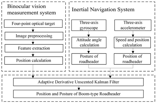 To enhance the stability and reliability of position measurement for boom-type roadheaders in underground tunnel environments, a positioning method based on binocular vision and fiber-optic strapdown inertial navigation is proposed. The visual measurement system features a four-point target, while the inertial navigation constructs the combination positioning system. Addressing the limitations of Unscented Kalman Filtering (UKF) in combined navigation systems, an Adaptive Derivative Unscented Kalman Filtering (ADUKF) algorithm is proposed to tackle accuracy degradation due to abrupt state changes. Specific filtering equations are derived for the maximum likelihood adaptive filter in order to enhance the adaptability of the combined system, minimize unnecessary computations, and improve filtering performance. Finally, the proposed method’s performance is evaluated through simulation calculations and laboratory experiments.