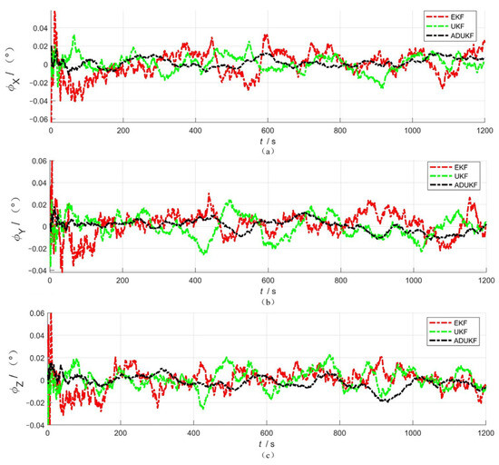 Comparison of attitude angle errors for EKF, UKF, and ADUKF.