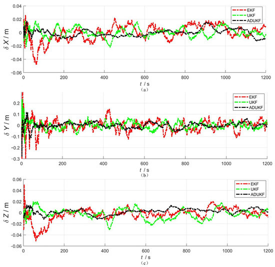 Comparison of position errors of EKF, UKF, and ADUKF.