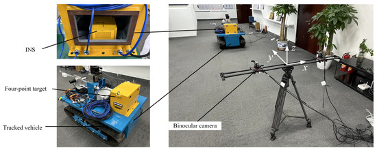 The system composition for the combination positioning experiment of the roadheader in the laboratory environment includes a tracked vehicle, a binocular camera (MV-HS510 CM2, Xi’an, China), a four-point target, an F70 L-M fiber-optic strapdown inertial navigation system, and a navigation host. The fiber-optic strapdown inertial system and the four-point optical target are rigidly connected. The constant drift of the tri-axis gyroscope in the inertial system is 0.020 (°)/h, with a random walk coefficient of 0.001 (°)/; the constant drift of the tri-axis accelerometer is 50 μg, with a random walk coefficient of 1 μg/. The vision system consists of a parallel binocular camera having a baseline length of 1000 mm and a focal length of 25 mm. The MV-HS510 CM2 cameras used in the system have a resolution of 2448 × 2048 pixels, with a pixel size of 3.45 μm. The calibration of the vision system was performed using Zhang’s calibration method, implemented through the MATLAB (2020a) Camera Calibrator toolbox. The extrinsic parameters obtained from the calibration process are presented in Table 3.