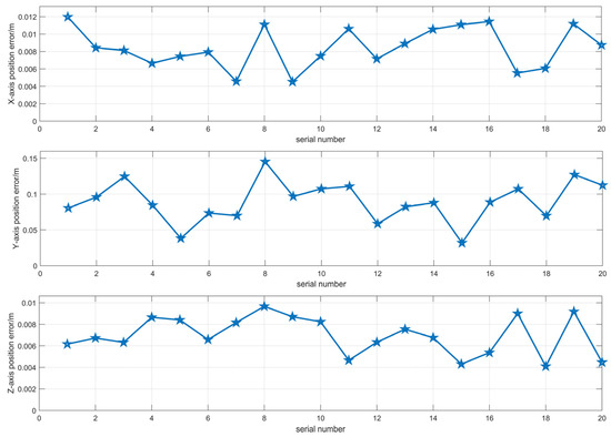 The tunneling machine operates in narrow underground spaces, requiring adjustments to its body posture and position after each cut. Therefore, this experiment utilized remote control of the tracked vehicle to simulate the necessary movement modes of the tunneling machine in actual working conditions, including straight movement, turning, reversing, accelerating and decelerating, and stopping. After each segment of motion, a marker point was established during the stop, with the marker point number recorded and its position measured using a total station. The experiment consisted of four sets of tests, with each set containing five marked points, resulting in a total of 20 measured motion points for the roadheader’s integrated navigation system. These points were subsequently used for positioning error analysis. Potential sources of error in the experiment include measurement inaccuracies from the equipment, as well as detection errors caused by variations in movement patterns and distances. The total station used in the experiment has a measurement accuracy of 1 mm, which is sufficient to ensure reliable data collection. To mitigate the impact of random errors, multiple sets of experiments were conducted, enhancing the statistical robustness of the results.
