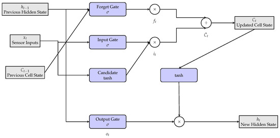 To achieve real time adaptation of sensor fusion weights, the LSTM cell operates at each time step to adjust the measurement noise covariance matrix dynamically. Figure 4 illustrates the internal mechanism of the LSTM cell, detailing its role in self-adaptive sensor fusion.