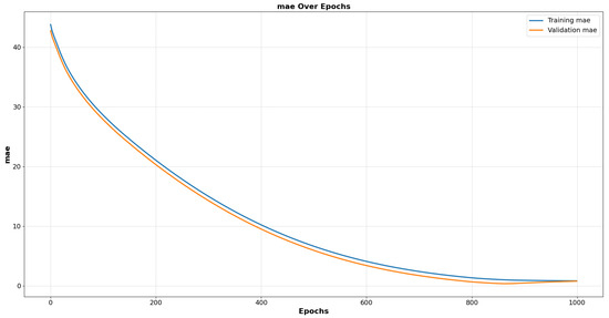 The MAE curves for training and validation, depicted in Figure 6, reveal a consistent decline over 1000 epochs, highlighting the model’s ability to minimize prediction errors. The MAE metric evaluates the absolute difference between the predicted and actual values, making it an effective measure for assessing prediction accuracy.