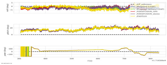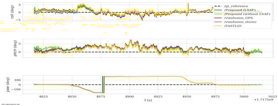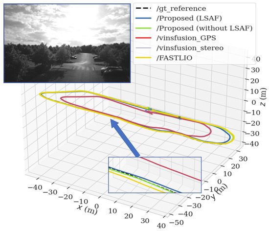 Table 5 presents the accuracy evaluation results for the proposed method and benchmark algorithms on the UL outdoor handheld dataset, highlighting the superior performance of the proposed system incorporating LSTM-based self-adaptive fusion (LSAF). The proposed method achieved the lowest RMSE of 0.598172, significantly outperforming benchmark methods such as FASTLIO2 (6.830505), VINS-Fusion (S+I+G) (6.846302), and VINS-Fusion (S+I) (7.18024). Additionally, the proposed system demonstrated a maximum error of 2.982927, which is substantially lower compared to the other methods, reflecting its robustness to outliers and sensor degradation.
