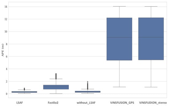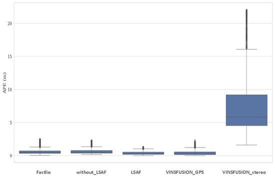 The absolute pose error (APE) plots for each axis in Figure 11, Figure 15 and Figure 18 further highlight the advantages of the proposed system. The box plots in Figure 10, Figure 14, and Figure 20 compare the overall APE distributions for all methods, showing that the proposed method achieves the smallest error spread and highest accuracy across the dataset. The LSTM-based adaptive fusion mechanism effectively mitigates sensor-specific errors by dynamically adjusting sensor contributions in real time. For instance, in regions where LiDAR features are sparse, the LSTM assigns higher weights to IMU or GPS or stereo camera data, thereby maintaining accurate state estimation.