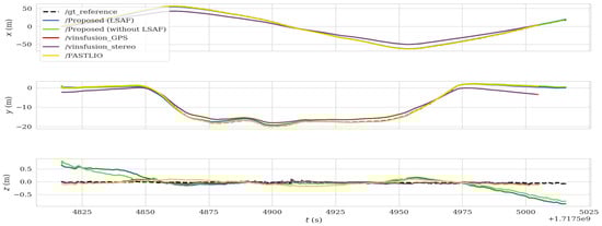 The inclusion of the LSTM-based adaptive fusion mechanism introduces several advantages over traditional fixed-weight fusion approaches. The dynamic weighting process enables the system to adapt to environmental changes and sensor degradation. For example, in bright outdoor conditions, the LSTM down-weights stereo camera data when visual feature density is low, prioritizing LiDAR and IMU measurements instead. Similarly, in areas with sparse LiDAR features, GPS data are weighted more heavily to mitigate drift. Figure 9, Figure 13, and Figure 17 demonstrate the proposed method’s ability to maintain trajectory accuracy despite varying sensor reliability. This is further supported by the quantitative metrics in Table 4, Table 5 and Table 6, which show that the proposed system consistently outperforms the benchmark methods in all scenarios. The adaptive nature of the LSTM allows the system to handle asynchronous and noisy sensor measurements more effectively than traditional Kalman filter-based fusion approaches.