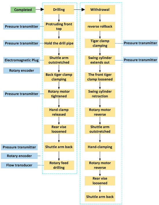 The drilling system drilling work process is shown in Figure 2. During the drilling process, after the drilling system attitude is stabilized, the front top extends out and completes the rod feeding work through the cooperation of the shuttle arm and the hand clamp. The rear vise and the slewing and drilling devices cooperate to complete the threaded connection between the rotary axis and the drill pipe. The drilling can then be carried out. In the process of retiring the rods, through the cooperation of the front and rear vises, swing cylinder, and hand vise, the threaded connections between the current drill rod and the previous drill rod, and between the current drill rod and the front top, are unlocked successively. The shuttle arm and hand vise transport the drill rods to the drilling tool store to complete the retiring process.
