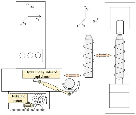 During the drilling process, the working sequence of the spatial movements of the drill pipe is as follows: hand clamp grasping → following the shuttle arm to move towards the drilling part → the front top to tighten the drill pipe → the slewing motor to tighten the threaded connection → the drill pipe rotates and feeds. In the coordinate system shown in Figure 3, after the hand clamp grasps the drilling tools on the jacking plate, the hydraulic motor drives the shuttle arm to drive the hand clamp along the direction of OY1 to transport the drilling tools to the drilling part; the drilling rod rotates and feeds along the OZ2 axis; the spatial movement of the drilling rod in the process of drilling back is the opposite of that in the process of drilling in.