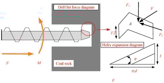 During the working process of the anti-punch drilling robotic drilling system, assuming that the coal rock properties and the drill pipe remain unchanged, the drilling speed will be related to the rotational speed and torque of the rotary mechanism, and to the feed force and feed speed of the feed mechanism. In order to obtain the optimal drilling parameters of the rotary mechanism and feed mechanism, a mechanical analysis of the drilling and cutting process is required [21].