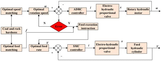 The block diagram of the control strategy of the drilling system is shown in Figure 5. When different coal rock hardness values are encountered, the control system matches the optimal rotational speed and the optimal feed rate for drilling. The control system first controls the rotary hydraulic motor to output the optimal rotational speed through the ADRC controller. Then, the SMC control controls the hydraulic output to output the optimal feed speed at the current rotational speed.