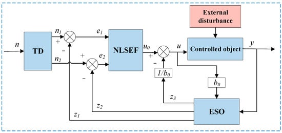 Self-immunity control is a new type of control method that represents an improvement on the PID control algorithm, which has structural characteristics that do not depend on the control object model , and do not distinguish between internal and external disturbances in the system. The commonly used self-immunity controller mainly consists of three parts: a tracking differentiator (TD), extended state observer (ESO), and nonlinear state error feedback (NLSEF) control rate components [22,23], the schematic diagram of the controller is shown in Figure 6.