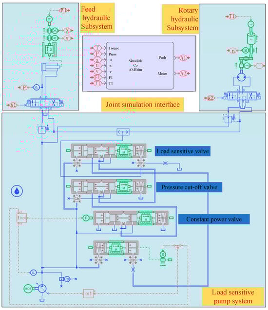 In order to verify the effectiveness of the cooperative control strategy for slewing and feeding based on the drilling motor priority proposed in this section, a joint simulation platform of the slewing mechanism and feeding mechanism of the drilling system of the anti-punching drilling robot based on AMEsim 2020.1 and Simulink 2020b was constructed and is shown in Figure 7. Simulink was mainly used to design the slewing and feeding controllers designed; the AMEsim model contains the load-sensitive pump system, slewing hydraulic subsystem, and feeding hydraulic subsystem.