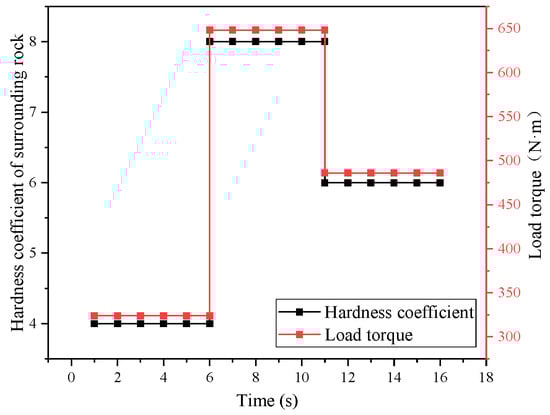 In the working process of the anti-punch drilling robot drilling system, changes in coal rock hardness and coal rock traits occur. The different coal rock traits cause changes in the drilling system; therefore, it is necessary to make timely adjustments to the rotary speed in the process of turning. From the above analysis and calculation, it can be seen that the variations in coal rock properties can be characterized by the Platt hardness coefficient. The relationship between the coal rock hardness coefficient and loading torque is shown in Figure 8.