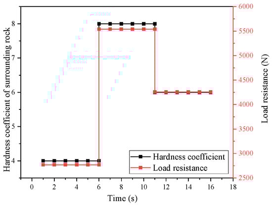 When the anti-punching robot performs drilling operations, the diversity of the coal rock properties has a significant impact on its feeding mechanism. The increase in the hardness coefficient of the coal rock, if not accompanied by timely adjustment of the feed speed, will lead to a surge in the amount of coal rock broken per unit in time. When the broken coal rock is not cleaned up in time, problems, such as holding or jamming of the drill, can occur, which will reduce the efficiency of drilling operations. With the frequent changes in coal rock characteristics in underground coal mines, it is especially critical to precisely control the feed speed to ensure that it can be automatically adjusted to the optimal speed according to different load conditions. The relationship between the hardness coefficient of the coal rock and the load resistance is shown in Figure 11.