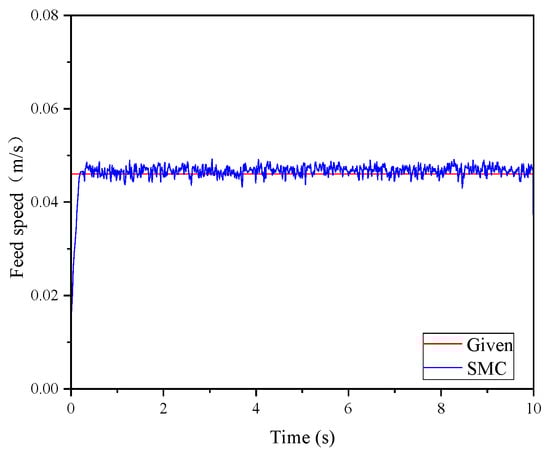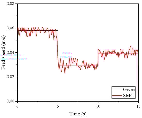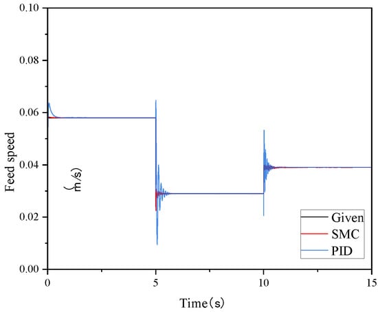 The simulation results show that there is a significant difference between the control effects of the SMC controller and PID controller. Both controllers have faster response speeds; however, the tracking effect of the PID controller on the desired feed rate under different coal rock hardness coefficients is poorer, there is more overshooting and more errors. In addition, the tracking curve produces a larger jitter when the coal rock hardness is changed abruptly, and the corresponding speed is obviously slower than that of the SMC controller.