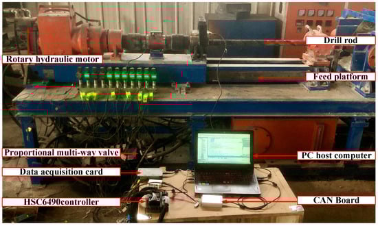 The construction of the experimental platform for the anti-punch drilling robot drilling system can be divided into the construction of the hardware and the construction of the software. The hardware construction included sensors, proportional valves, data acquisition cards, controllers, etc., which were connected according to the electrical schematic diagrams. The software construction included the design of the control system, the writing of the control program and control strategy, and so on. The experimental system platform built for this experiment is shown in Figure 14.