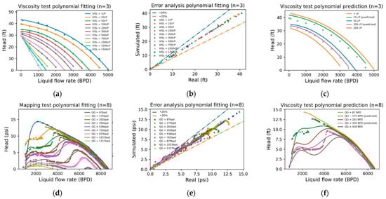 Polynomial fitting and interpolation for ESP high-viscosity flow and gas–liquid flow. (a) MTESP viscous flow fitting result. (b) MTESP viscous flow fitting error. (c) MTESP viscous flow interpolation. (d) GC6100 gas–liquid fitting result. (e) GC6100 gas–liquid fitting error. (f) GC6100 gas–liquid interpolation.