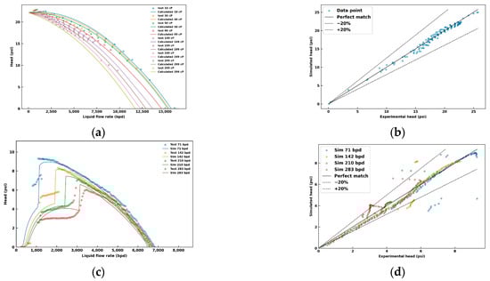 Mechanistic model [1,19] for ESP high-viscosity flow and gas–liquid flow. (a) MTESP viscous flow mechanistic model result. (b) MTESP viscous flow mechanistic model error. (c) GC6100 gas–liquid flow mechanistic model result at 2400 RPM. (d) GC6100 gas–liquid flow mechanistic model error at 2400 RPM.