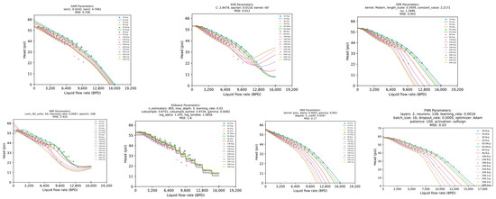 All of the machine learning models were initially trained using a relatively small dataset, specifically the ESP3 high-viscosity flow pump curve dataset. The optimal model structures were determined using the Optuna framework. Figure 5 presents the final model structures, the mean square error (MSE), and the predictions, with the figure titles highlighting the model structures and corresponding loss information. The results indicate that the GAM, RBF, and XGBoost models failed to accurately predict the pump performance. While the SVR and KRR models exhibited low MSE values, their predictions did not align with the physical shape of the pump performance curve, particularly in the tail region. In contrast, only the GPR and FNN models produced predictions that both accurately captured the pump performance and adhered to the physical pump curve shape.