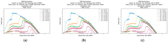Figure 7a illustrates the FNN predictions trained solely on the original measured data points, including the liquid flow rate, gas flow rate, head, and speed. The results show that this approach failed to capture the two-step changes in the pump surging performance. In contrast, Figure 7b,c depict the predictions obtained after adding calculated parameters, such as the pump intake gas void fraction (GVF), mixture fluid density, and mixture fluid viscosity. Although these parameters are straightforward calculations derived from gas and liquid flow rates, the inclusion of the GVF clearly improved the prediction accuracy of the FNN model.