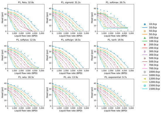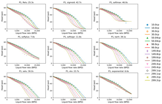 In Figure 10, the FNN model, using the exact same structure and activation functions as in Figure 9, was trained on another dataset: the high-viscosity curve dataset from the MTESP pump. This dataset was generated through CFD simulations, which were first validated against experimental results and then extended to include data points for the high-flow-rate and high-viscosity conditions. Despite the FNN model structure not being finely tuned for this dataset, the predictions remained highly accurate. Notably, only the FNN models with the softsign, tanh, and elu activation functions successfully predicted pump curves that closely aligned with the physical curve shape. Given the comparable results between Figure 9 and Figure 10, it is evident that the choice of activation function plays a significant role in the accurate prediction of ESP pump curves. The softsign, tanh, and elu activation functions are highly recommended for such tasks. Alternatively, the selu and exponential functions may also be used as substitutes if required.