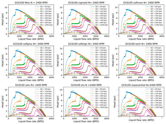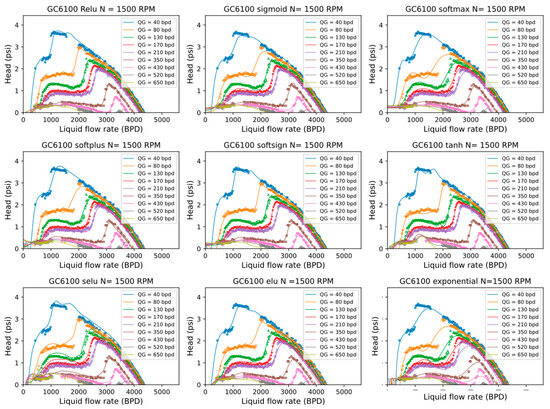 As shown in Figure 12, the FNNs with the softsign, relu, and tanh activation functions produced smoother and more realistic performance curves across the gas–liquid flow conditions. However, in Figure 13, they show slight discrepancies in the surging region, where the softmax function outperforms the others. It is worth noting that the sigmoid and exponential functions exhibited smoother behavior; however, their relatively higher error makes it an engineering decision to balance the trade-off between accuracy and the desired shape of the predicted pump curves.