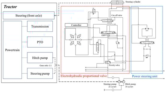 In agricultural tractors, electronically controlled hydraulic steering systems, which include electrohydraulic proportional valves (EHPVs), are commonly used for automatic steering. Over time, steering systems have evolved in various ways. In passenger vehicles, electric power steering (EPS) systems with motors or steer-by-wire technologies that eliminate mechanical connections have become standard. However, in large trucks, construction machinery, and agricultural equipment, electronically controlled hydraulic steering systems are preferred due to their stability under load and high reliability [9]. An electronically controlled hydraulic steering system operates by regulating the steering pump through an electronic control unit (ECU) or by managing fluid flow through electronically controlled valves. Integrating an EHPV into a tractor’s automatic steering system offers two main benefits. First, it provides design flexibility by eliminating the need for a separate steering pump. Second, the EHPV enables the continuous, precise control of fluid flow and is usually connected to a controller with a feedback loop [10]. The precise control enhances the steering responsiveness and performance of the automatic steering system [11].
