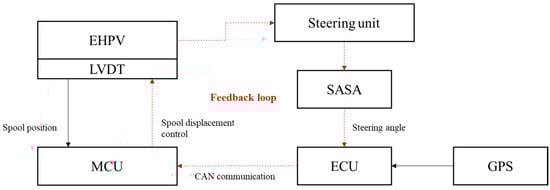 The control flow of the automatic steering system is illustrated in Figure 2. The microcontroller unit (MCU) of the steering system was connected to the LVDT installed on the directional control valve spool of the EHPV to measure the spool displacement. A Steering Angle Sensor Assembly (SASA) was mounted on the tractor’s steering column, providing steering angle data of the tractor measured by the left and right axle sensors. The MCU received steering angle, tractor motion, and GPS position information via CAN communication. Upon initiation of the automatic steering sequence, a target steering angle was generated by a GPS-based steering algorithm, and the spool was controlled accordingly. The spool feedback control was executed by utilizing real-time steering angle feedback from the SASA sensor.