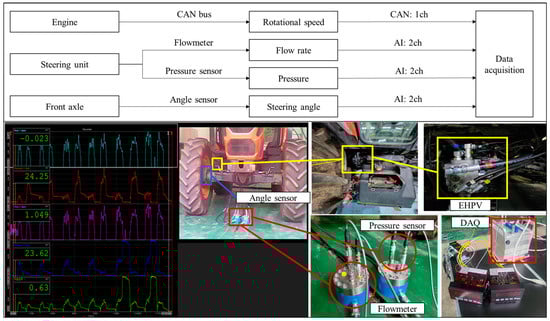 The measurement system for assessing the flow rate and pressure characteristics of the EHPV under various operating conditions is illustrated in Figure 3. This system included two flow meters, two pressure sensors, two angle sensors, and a data acquisition (DAQ) system. The flow meters (Hysense PR130, Hydrotechnik, Limburg an der Lahn, Germany) and pressure sensors (Hysense QG100, Hydrotechnik, Limburg an der Lahn, Germany) were mounted on each hydraulic hose connecting the EHPV to the steering cylinder. Steering angle sensors (424A, Elobau, Leutkirch, Germany) were attached to the left and right front wheels of the tractor. Measurement data were collected and stored on a PC via the DAQ system (Q.brixx A107, Gantner, Nuziders, Austria), with the sampling rate set at 1000 Hz. The specifications of the measurement system are provided in Table 3.