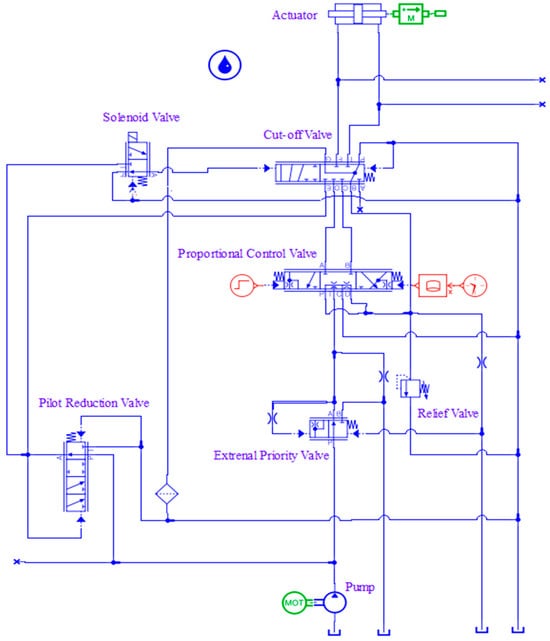 A simulation model of the EHPV was developed, as shown in Figure 5. To simplify the hydraulic pump, a motor was used instead of an engine. The pump delivered flow rates of 18.9, 29.4, and 46.2 LPM at engine speeds of 900, 1400, and 2200 rpm, respectively. The EHPV model was designed based on actual valve specifications and design data. The main directional control valve in the EHPV was simplified to a signal input system using a proportional control solenoid valve. The control signals were modeled exactly as in the experimental setup. The steering unit employed a double-acting actuator model, excluding the standard tractor steering structure.