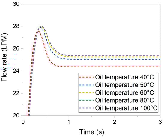 Figure 7 illustrates the control flow characteristics of the priority valve under various hydraulic oil temperature conditions. As the operating oil temperature increased, the viscosity of the steering oil decreased, leading to an increase in pilot circuit pressure due to the rise in internal flow resistance within the valve. Consequently, the control flow rate of the priority valve exhibited an increasing trend with rising oil temperature, with the maximum flow rate also showing an upward tendency. Notably, beyond approximately 60 °C, the rate of increase in control flow diminished significantly, and the difference in control flow between 80 °C and 100 °C was numerically negligible. Specifically, the control flow rate of the priority valve increased from 24.33 LPM at 40 °C to approximately 25.4 LPM as the temperature rose. The detailed characteristics of priority valve flow rates under different hydraulic oil temperature conditions are presented in Table 7.