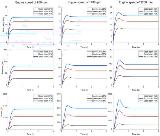 At an engine speed of 900 rpm, the system exhibited minimal overshoot. Under the 1400 rpm condition, overshoot exceeded 5% in all cases except for one. At 2200 rpm, overshoot increased significantly, reaching 12.2% or higher. The overshoot in pressure was more pronounced than that in flow rate, and the hydraulic power demonstrated a maximum overshoot of 45.9%. The rise time of the system decreased as the engine speed increased, which could be attributed to the higher supply flow rate allowing the system to reach the target flow rate more rapidly. Conversely, the settling time tended to increase with engine speed, as more overshoot required more time for the system to stabilize.